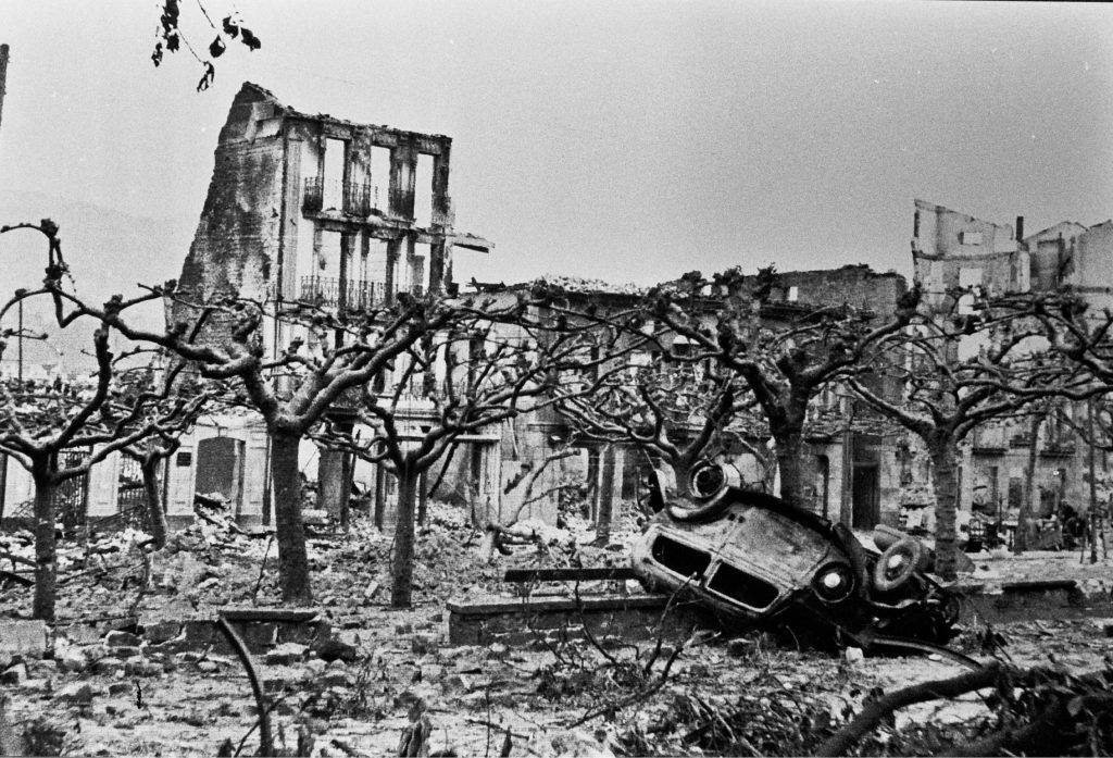 Según el informe del Servicio Nacional de Regiones Devastadas – un organismo de la dictadura destinado a evaluar los daños materiales provocados durante la guerra, así como los posteriores trabajos de reconstrucción- el 85,22% de los edificios, un total de 271, fueron totalmente destruidos y el resto parcialmente afectados.